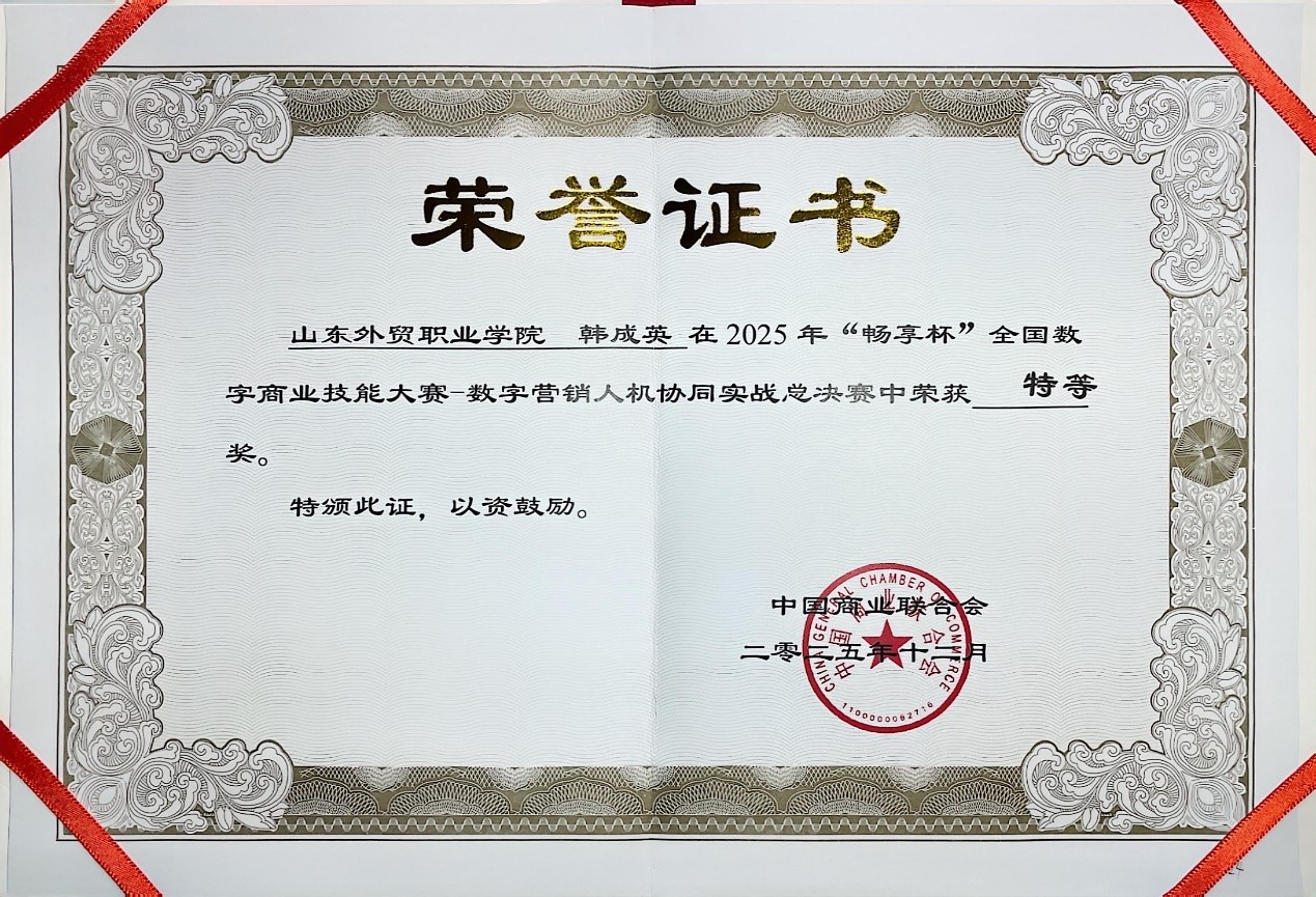 12月20日至22日,2025年“畅享杯”全国数字商业技能大赛总决赛在北京举行,我院教师韩成英凭借深厚的专业素养和高超的专业技能脱颖而出,荣获特等奖。