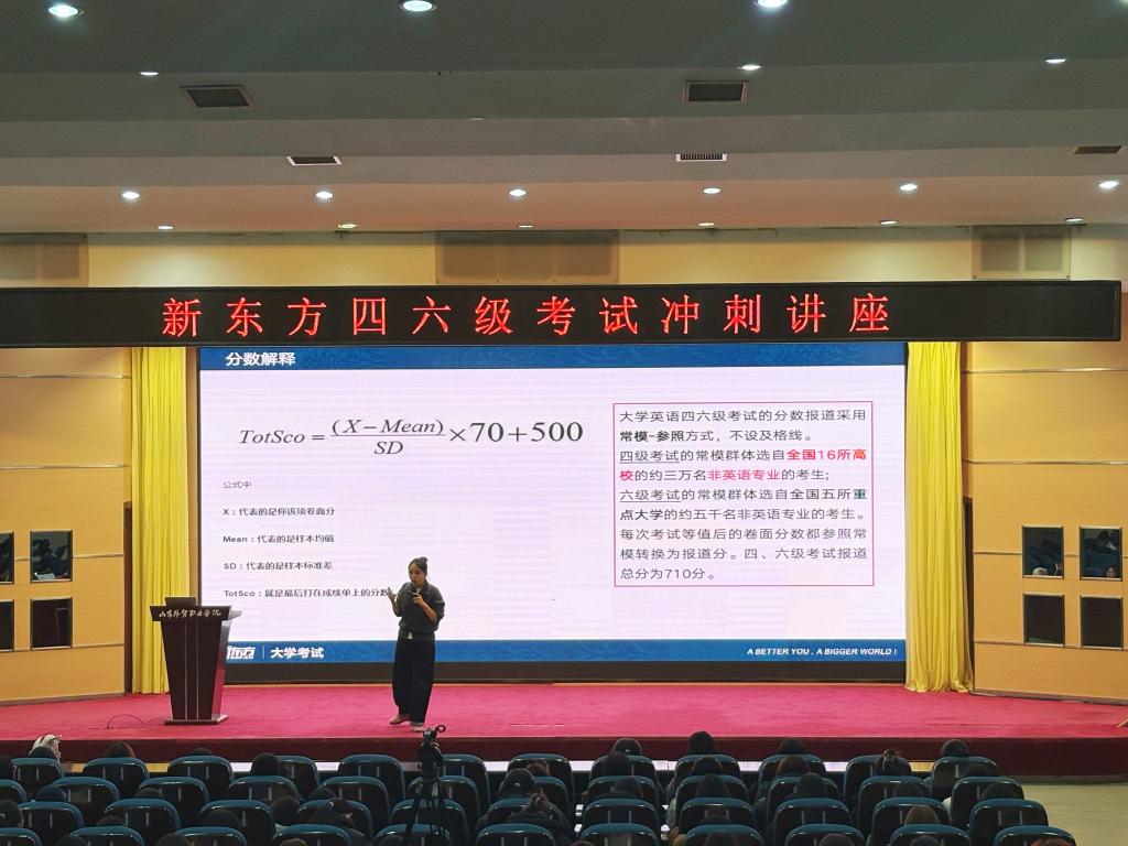 为助力我院学生精准把握四六级考试要点、科学规划备考,11月27日下午,图书馆特邀新东方资深英语名师于静,在学术报告厅举办了一场内容丰富的四六级考试冲刺讲座。活动吸引400余名学生踊跃参与,现场氛围热烈。