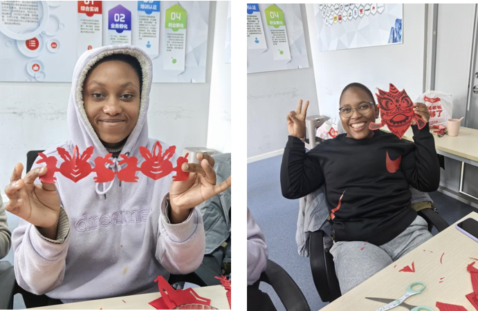 活动中,学员师生欢聚一堂、共迎新春。包饺子现场,师生手把手指导学员和面、擀皮、包馅,大家边做边聊,气氛热烈融洽。热气腾腾的饺子,让大家真切体会到中国春节“团圆、分享”的文化内涵。在剪纸、写福字、写春联等民俗体验中,学员们了解传统艺术寓意,亲手创作作品,在实践中感受中华文化的独特魅力。