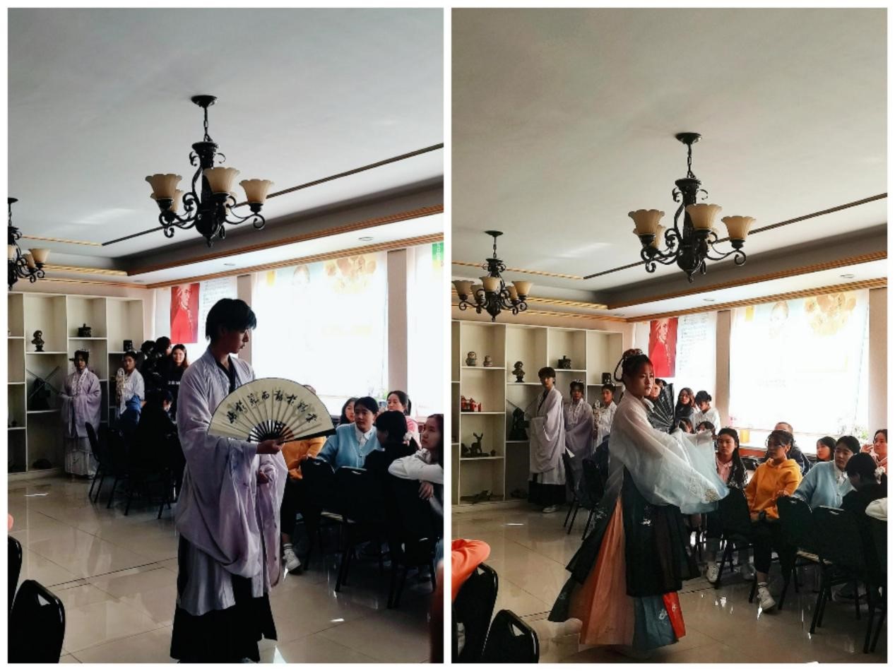 活动伊始,俱乐部邀请汉服举办了一场精彩的汉服走秀,身着汉服的文人雅士、美女佳人既展示了汉服的服饰美,也展示了中华礼仪文化之美。随后,俱乐部成员分别用英语介绍了不同种类汉服的特点和用途。活动中,Rebacca也和参与活动的学生们一起换上汉服,亲身体验了中国传统服饰的独特魅力,并热情地介绍了外国的传统服饰,分析了其与中国古典服饰的不同时代文化背景。
