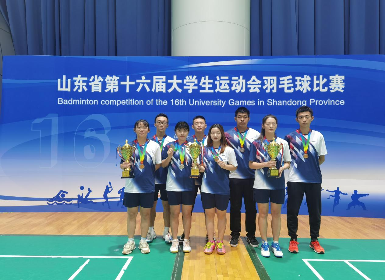 10月17-23日,第十六届山东省大学生运动会羽毛球比赛在青岛国信体育馆举行,我院组成由基础教学部曲振琳、马超担任教练,苗龙云、陈鑫迪、马浩培等8名选手参赛的代表队。经过激烈角逐,我院最终夺得本届比赛乙组女子团体第二名,男子团体第八名。在单项赛中,苗龙云获得女子单打亚军;陈鑫迪、马浩培获得混合双打季军;苗龙云、马浩培获得女子双打季军。