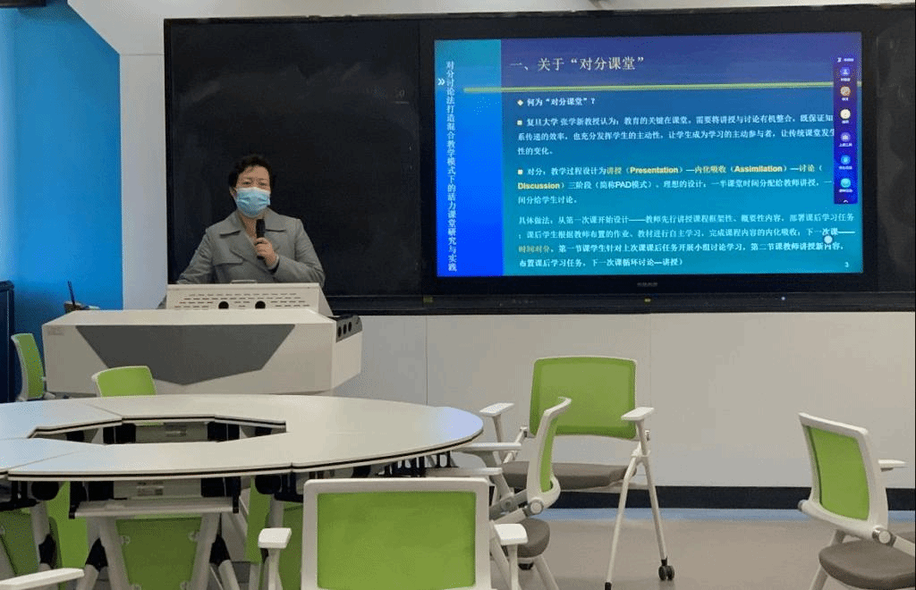 在专项研讨会上,张华教授做了《对分讨论法打造混合教学模式下的活力课堂》主题汇报,详细讲解了“对分课堂”教学模式,并结合自身实践,介绍了“对分课堂”的教学经验。提出将教学过程设计为讲授-内化吸收-讨论的三段形式,在教学实践中将课堂实践对分为一半课堂讲授,一半学生理解讨论的对分课堂模式。重点深化学生参与课堂讨论环节,建立规范化的“亮-考-帮”高质量课堂讨论模式。