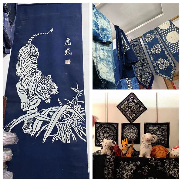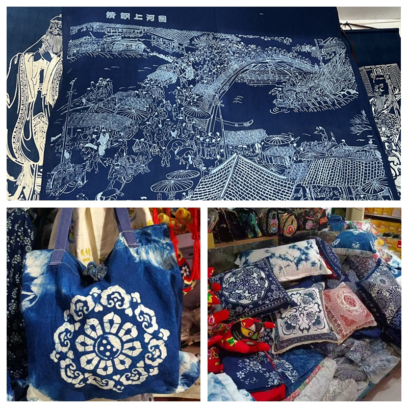 蓝印花布在中国民间艺术中堪称独树一帜,被称为中国民间手工艺的“活化石”。周家老染坊内摆满了由蓝印花布制成的折扇、提包、桌布、服装、鞋等各式生活物品,以及清明上河图、孔孟画像、梅兰竹菊、戏曲脸谱等各种蓝印花布艺术工艺品。
