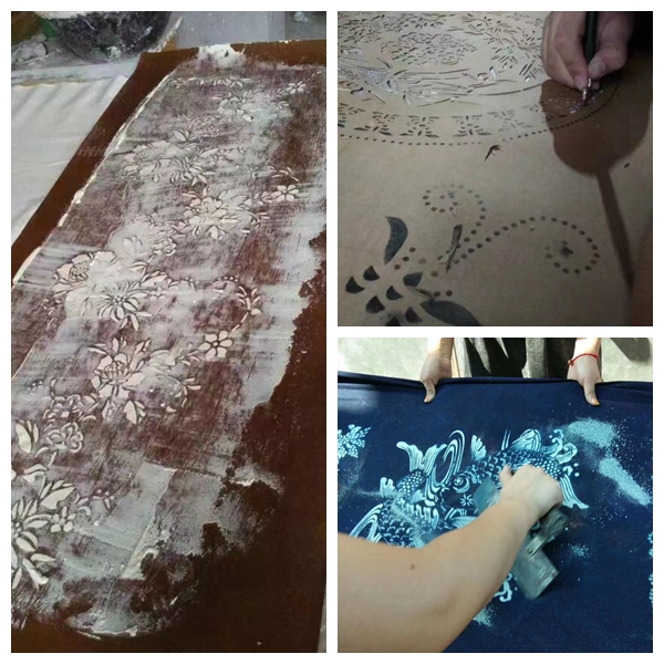 周家老染坊蓝印花布手工印染技艺采用纯植物靛蓝染色,用石灰和黄豆按照1:1比例加工制作防染剂,选用100%棉布,去浆水洗之后,经过设计花纹、制版、调制防染浆、拷花、调制染料、染色、刮灰、清洗、晾晒等九道工序染织而成。