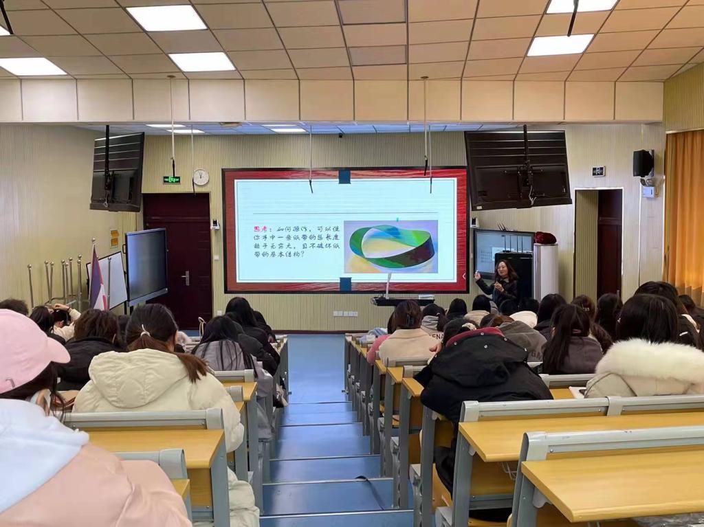 讲座伊始,吴晓明从实数系的构造为切入点,向同学们介绍了逻辑思维能力的形成过程。接着,她着重讲解了数学可以探索事物本质,将至繁归于至简,向同学们介绍了三种“不像数学的数学”——群论、度量空间、拓扑学。随后,她又举例说明了数学与艺术和文学的共通点。最后,她以华为创始人兼CEO任正非的一句“国家若要强盛,数学是基础”与同学们共勉。讲座过程中,吴晓明与同学们频繁互动,现场抢答趣味连连。