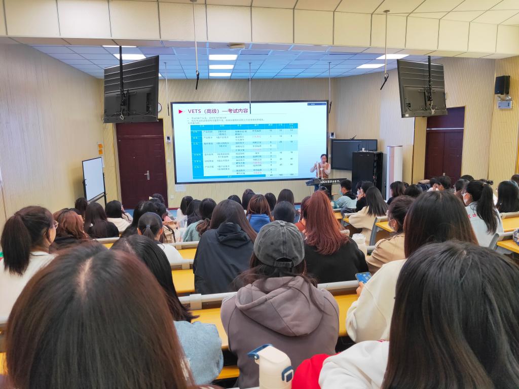 公共英语部主任崔卫,教研室主任丁莹莹,指导教师甄婷婷、张艳以及80名备考的学生参加了动员会。会上,丁莹莹进行了VETS考试介绍,包括等级标准、考试题型、学习建议等相关内容,结合VETS考试涉及到的产品营销、产品推介、接待策划、违约处理、活动策划、产品升级六大工作任务进行逐一解读,为考生理清思路,指明备考方向。随后,来自20报关1班的李凯欣和20国际贸易4班的边姿晓分享了参加VETS考试的经验和备考心得,就备考过程、答题注意事项以及备考心态调整等方面进行了分享,鼓励即将参加考试的学弟学妹安心准备,信心满满参加考试。最后,崔卫做动员讲话,介绍了VETS考试的地位和作用、上半年VETS考试情况和本次考生遴选情况,以及辅导教师团队的计划安排,鼓励学生珍惜机会,以最佳状态迎接考试。