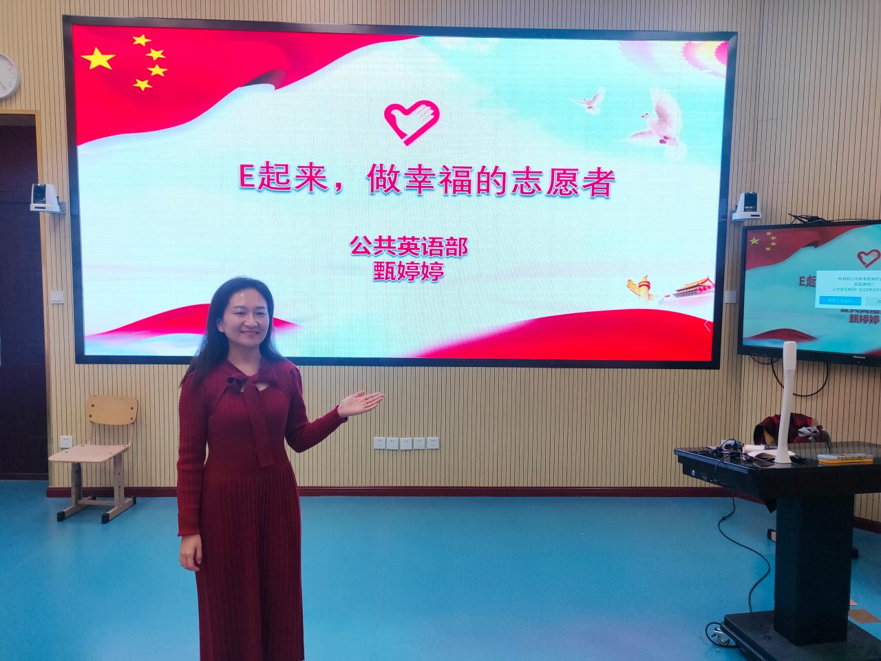 在国际志愿者日到来之际,为弘扬志愿服务精神,培养青年学生的社会责任感,号召大学生积极参与志愿服务,11月24日下午,公共英语部教师甄婷婷在1号教学楼第3阶梯教室举行了题为“E起来,做幸福的志愿者” 的讲座。