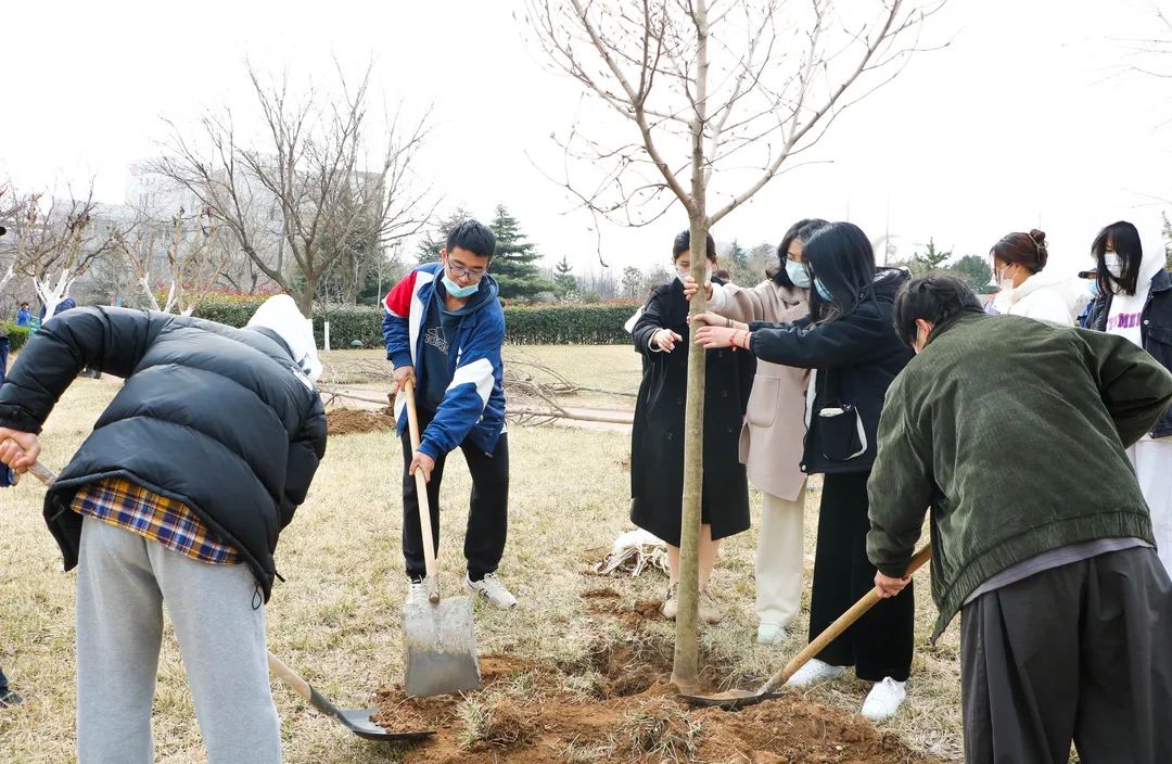 老师和同学们了解栽树的流程之后,干劲十足,系领导、老师身体力行,扶苗、培土、夯实、浇水……同学们虽然动作略显生疏,但是一铲一锹中透露着仔细与认真,小心呵护着每一棵树苗。在老师和同学们的齐心协力、默契配合之下,一棵棵樱花、海棠、玉兰迎风挺立,焕发出勃勃生机,大家用辛勤的汗水为初春的校园增添了一抹新绿。