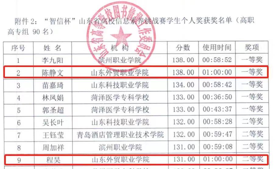 6月24日 ,“智信杯”山东省高校信息素养挑战赛决赛圆满闭幕,我院2020级国际贸易系学生陈静文以全省第二名的成绩斩获大赛一等奖, 2021级信息工程系学生程昊以全省第九名的成绩斩获大赛二等奖。