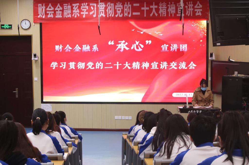 为了学习贯彻二十大精神,更好的团结引领广大青少年紧跟党的步伐,奋进新征程,财会金融系团总支“承心”宣讲团于11月12日下午在第一阶梯教室举办“学习贯彻党的二十大精神”宣讲会,财会金融系优秀团员干部参加了本次宣讲。