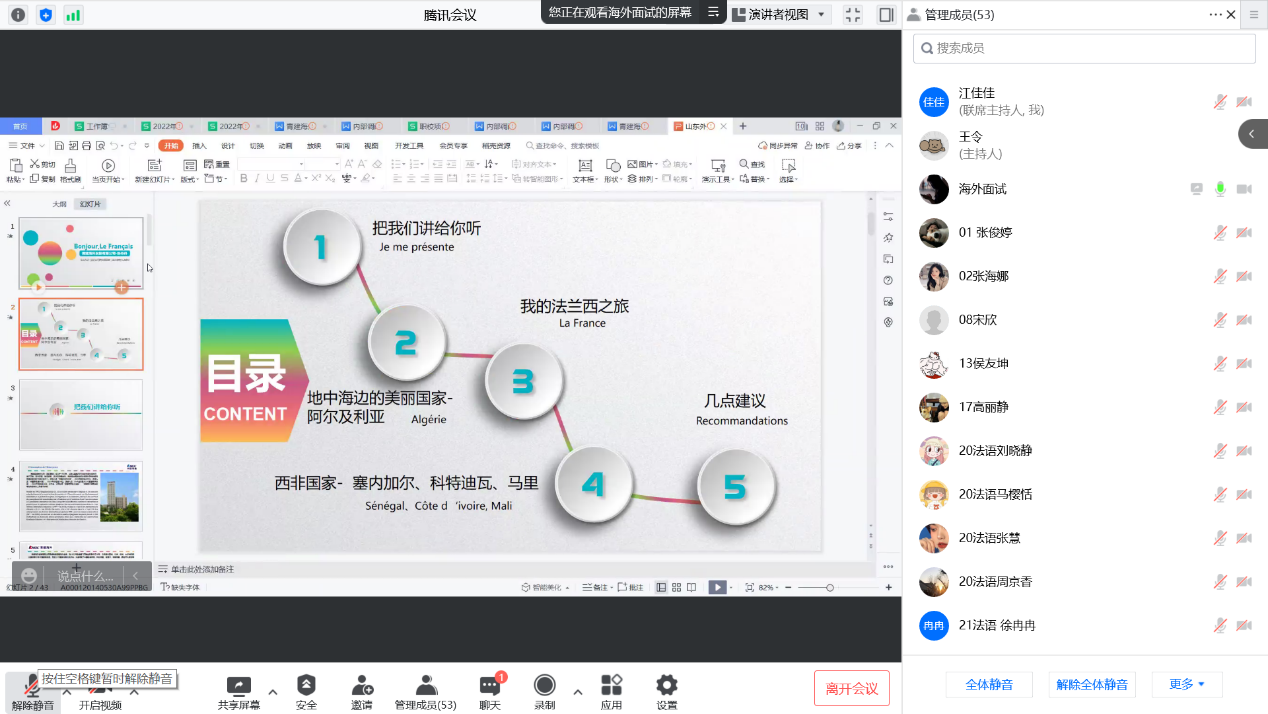 近日,商外大讲堂系列讲座《你好!法语》通过腾讯会议在线举行。讲座由学院合作企业青建海外发展有限公司人力资源部副经理张丹丹主讲,2020级、2021级应用法语全体同学及法语专业老师认真聆听了讲座。