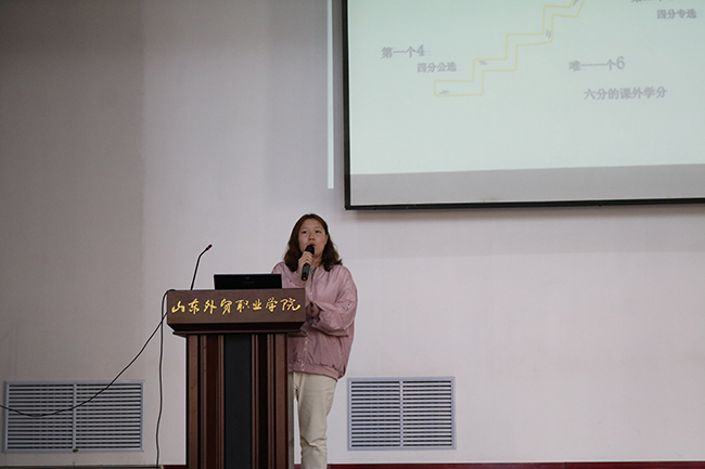 首先进行交流的是国际贸易系一等奖学金获得者王丽静,她分享了自己的学习方法:要打牢基础、学好专业课;要敢于尝试,日积月累学好英语,要赢得成功只有努力、努力、再努力。接着是财会金融系一等奖学金获得者赵金霞,她分享了该系管理制度、班委工作和学分制等内容,结合自身经历讲述了自学、自立和自律能力的重要性。随后是经济管理系的郭玉娴,她着重分享了英语学习的重要性,讲述了自己在外语培训学校兼职担任助教的经历,强调要走出校园,增加社会阅历,不断提升交际能力。最后一位分享的是原学生团总支书记张宇龙,她重点介绍了自学考试、英语四六级和社团活动等,建议大家要主动融入课堂,养成良好习惯,积极参加校园活动,不放松、不放弃,坚持到底,奋勇争先,让自己的大学生活多姿多彩。在互动环节,现场同学纷纷提出自己关心的问题,4位同学都耐心细致地一一作答。