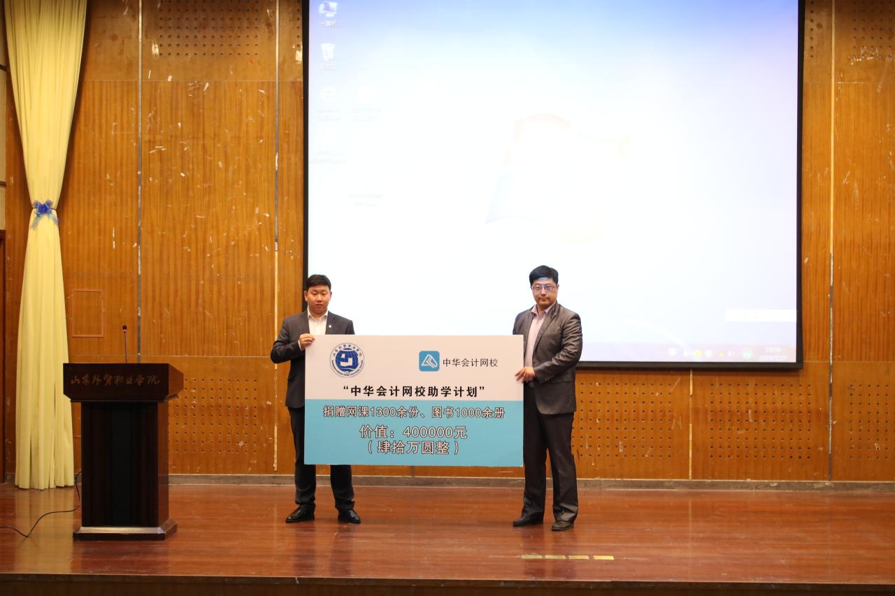 周新征代表财金系向张时赫一行表示了热烈欢迎和感谢,他着重介绍了财金系的发展现状和专业群的建设情况。张时赫总监介绍了正保教育集团的助学计划项目,并就下一步产教融合的项目做了详细介绍。双方以本次助学计划作为双方开展校企合作的起点,积极探索开展更深层次的产教融合与校企合作项目,实现资源共享、优势互补,进一步提升育人质量。唐智昊代表财金系接受了中华会计网校捐赠的总价值40余万元的网课和图书等学习资料。2017级会计专业学生高雪梦代表受赠学生对学校和正保远程教育集团的助学计划做了感谢发言。捐赠仪式后,中华会计网校特聘讲师洪宇为师生做了一场关于财会专业人员职业生涯规划的讲座。