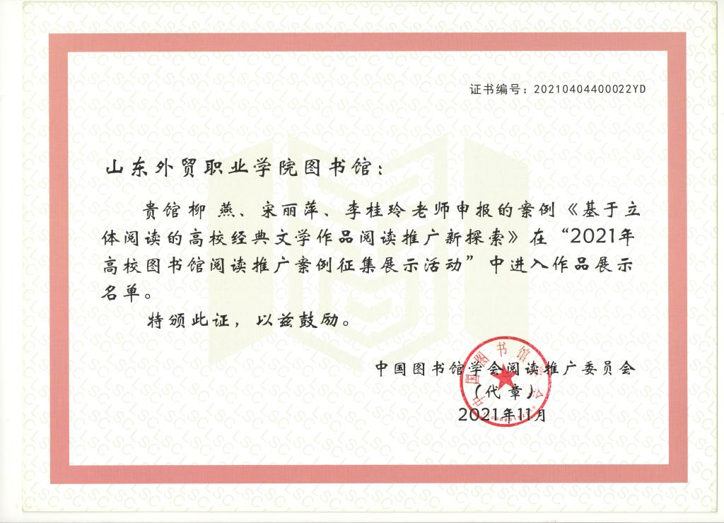 近日,由中国图书馆学会阅读推广委员会主办的“2021年高校图书馆阅读推广案例征集展示活动”名单公布,我院图书馆柳燕、宋丽萍、李桂玲老师报送的案例《基于立体阅读的高校经典文学作品阅读推广新探索》成功入选。