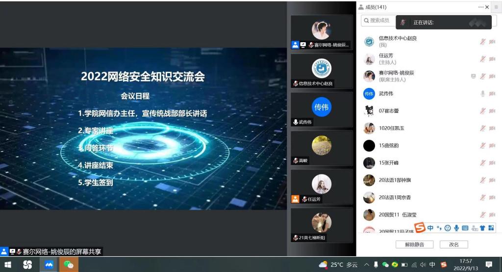 宣传周期间,我院邀请了网络安全方面的专家为师生举办在线网络安全公开课,普及网络安全知识、提高网络安全意识,取得良好效果。安全专家自上而下,由浅入深,阐述知识,总结经验,通过大量的实际案例进行讲解,同学们纷纷表示对网络安全有了深入的理解,知道了如何进行防护。现场还通过有奖问答的形式,吸引了在场同学的积极参与, 许多学生还主动分享了亲身经历的网络安全案例,引发在场同学的共鸣,通过“明辨身边事 筑牢安全墙”,提高网络安全意识。