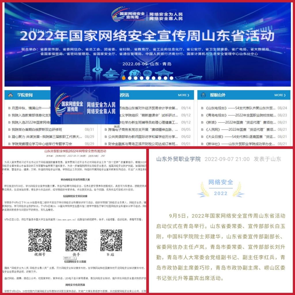 为认真贯彻中央网信办、省委网信办和省教育厅相关文件精神,加大网络安全宣传力度,强化师生网络安全意识,积极营造安全、健康、文明、和谐的校园网络环境,9月5日至11日,我院围绕“网络安全为人民,网络安全靠人民”的主题,开展了山东外贸职业学院2022年国家网络安全宣传周(以下简称“宣传周”)系列活动。活动中,广泛开展网络安全宣传教育活动,广大学生和教职员工积极参与,深入学习贯彻习近平总书记关于网络安全工作的重要思想和重要论述,充分展现党的十八大以来国家网络安全工作取得的重要进展。