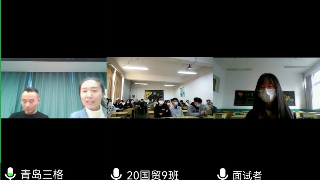 培训由辅导员刘腾主持,通过“腾讯会议”,以模拟真实面试现场形式展开,青岛三格建筑科技有限公司翟存仓、王宏玲两位指导老师给2020级国际贸易实务9班、10班每班5位学生代表进行网上面试,其他学生现场观摩、体验。