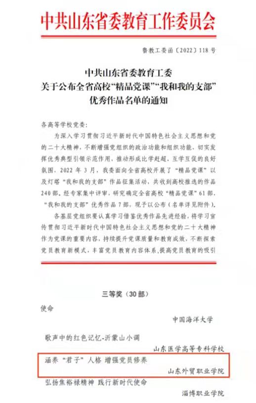 近日,中共山东省委教育工委公布了全省高校“精品党课”“我和我的支部”优秀作品名单,我院教师王艳玲的《涵养“君子”人格 增强党员修养》荣获全省高校“精品党课”三等奖。
