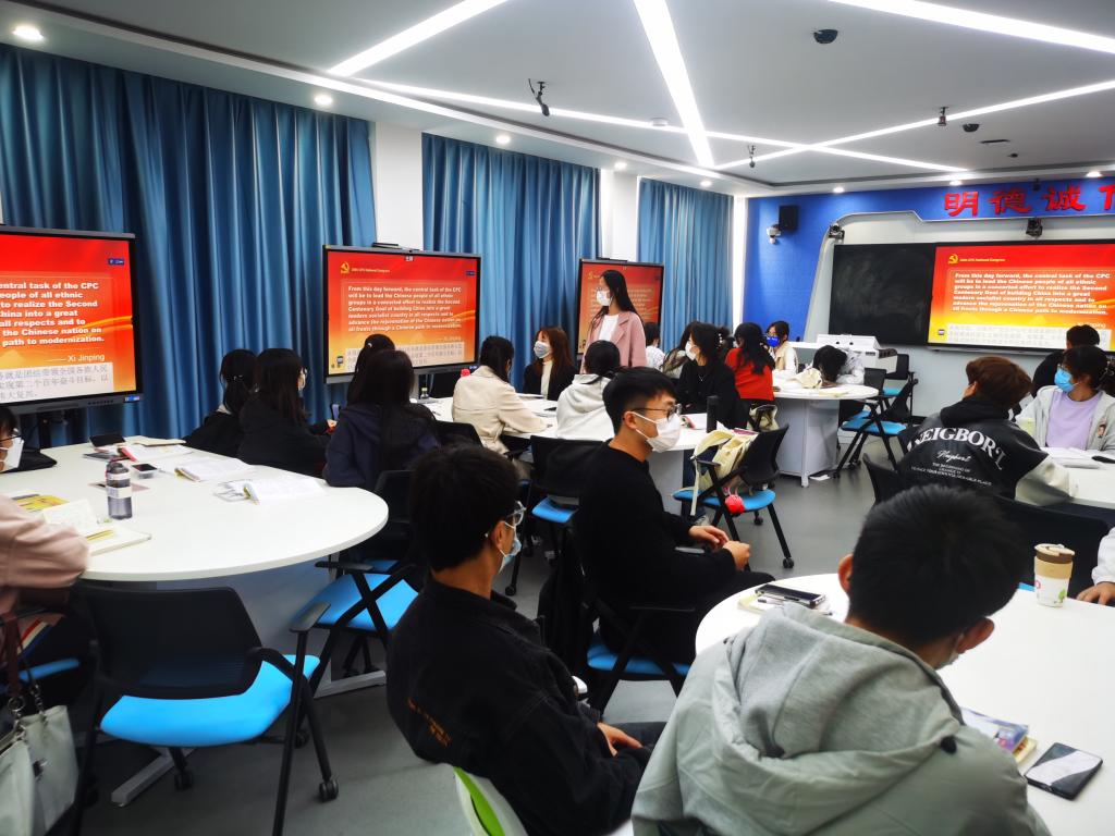 同时,各教研室围绕党的二十大相关内容展开课程思政集体备课活动。结合学生喜闻乐见的形式,教师集思广益,巧妙设计了包括问卷星测试、智能课堂抢答活动、拖拽游戏等近十种不同形式的课堂教学活动,寓教于乐,达到溶盐于水的效果。此外,公共英语部还将组织学生参加“喜迎二十大 团结奋进向未来”英文手抄报等学生活动,为学生提供更多英语展示的平台,以学生喜爱的方式,抒发对祖国和党的热爱,展现青年人朝气蓬勃的活力,用英语讲好中国故事,
