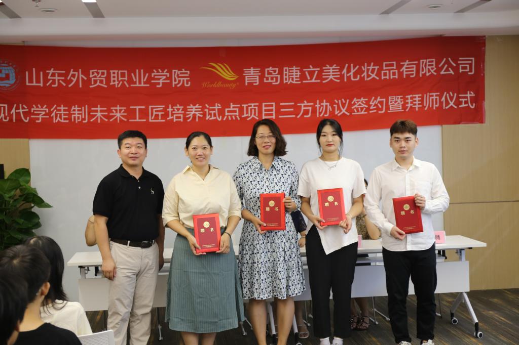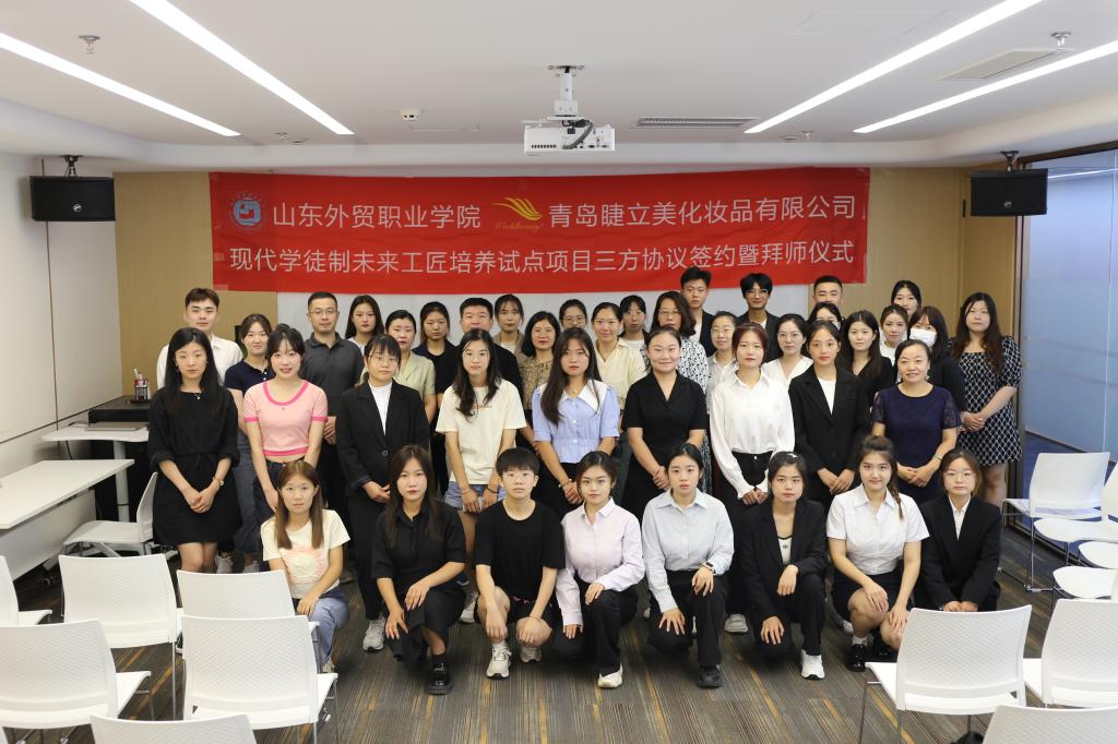 8月23日,国际贸易系与青岛睫立美化妆品有限公司共同举行现代学徒制三方协议签约暨拜师仪式。青岛睫立美化妆品有限公司人力资源主管孙畅,国际贸易系主任刘希全、副主任张宗英以及企业导师代表、现代学徒制班级全体同学参加了仪式。