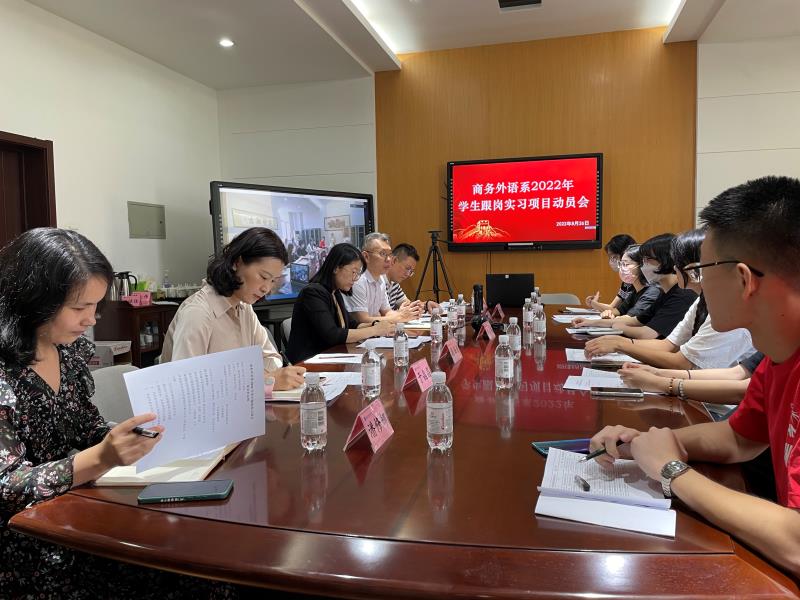 8月26日,商务外语系在图书馆三楼会议室召开2022年学生跟岗实习项目动员会。商务外语系党政负责人、企业负责人、校内指导教师及参加实习项目的同学参加了动员会。