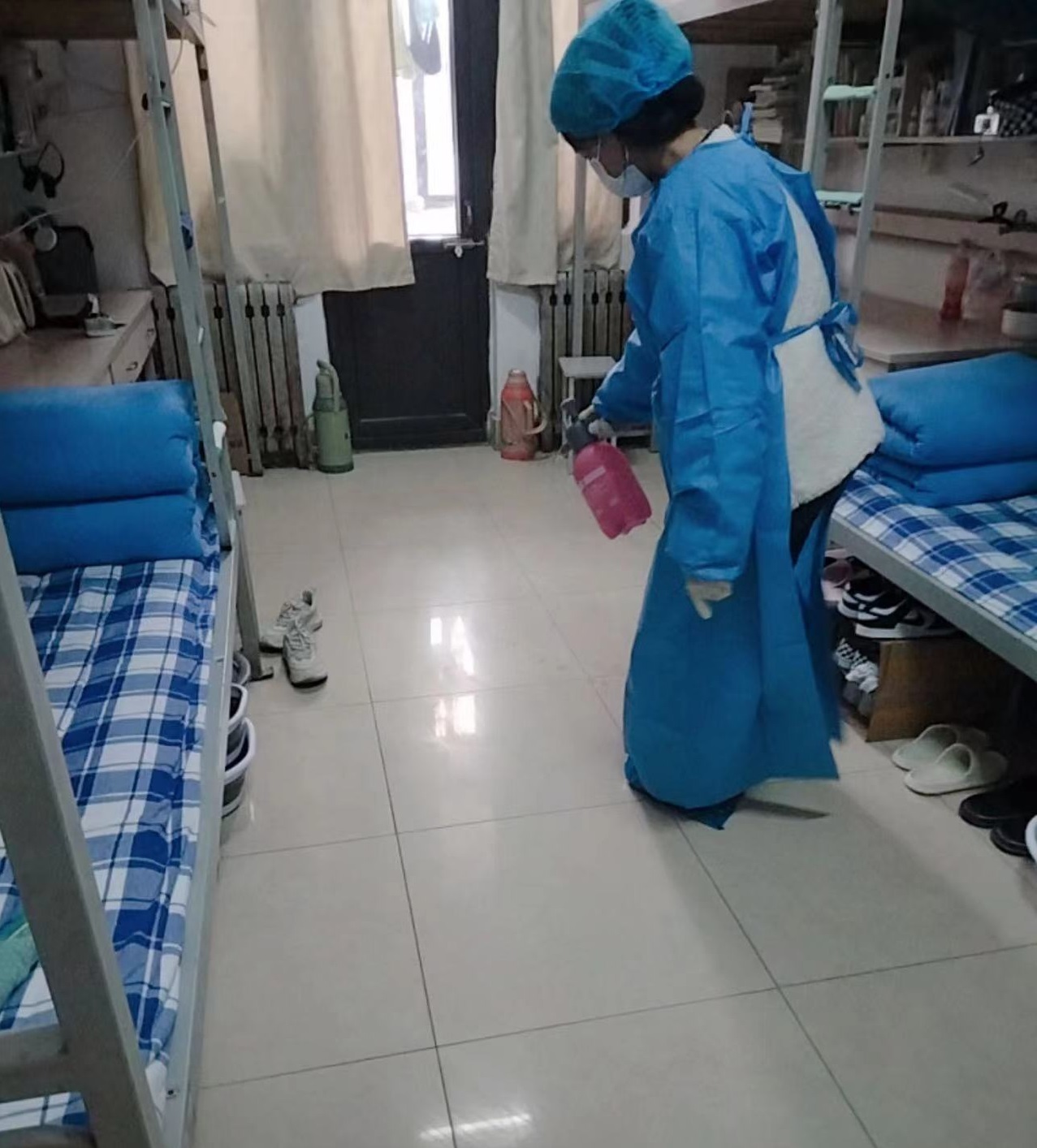 经后勤服务处工作人员专业消杀培训后,学生志愿者按照操作规范要求,分别对生活楼各宿舍区域依次进行卫生清扫、熏杀消毒、开窗通风等操作,物业工作人员对卫生间、盥洗室、楼道大厅等区域做好保洁消杀服务。学院负责老师同时开展传染病预防宣传及宿舍内务检查工作。