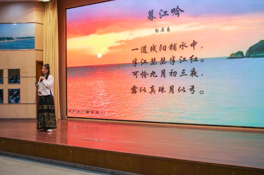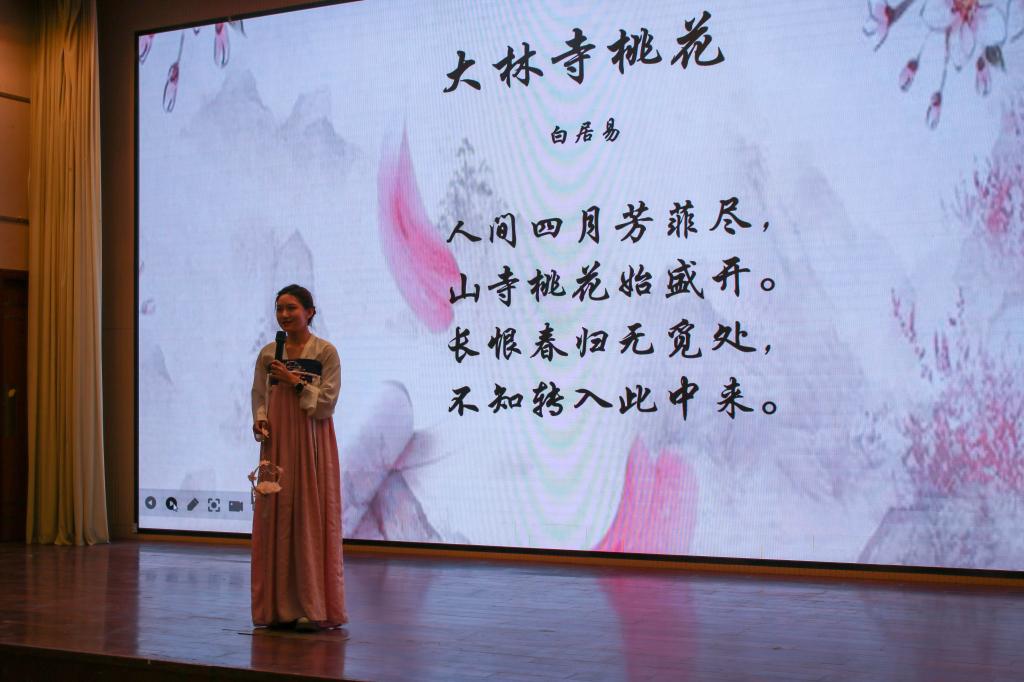 商务外语系学生杜宜珍等表演了诗朗诵《雅颂》,传承创新中国传统诗词文化,践行中华文化更好走向世界。学生们身着汉服,用英语表演了《登鹳雀楼》《枫桥夜泊》等八首文版中国古诗词诵读,精湛的表演获得现场的好评。