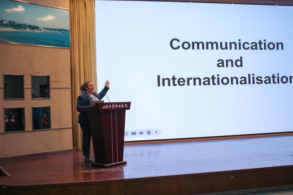 外教Rebecca做了以“沟通与国际化”为题的英文主旨演讲。演讲现场由中译语通智能语言盒子呈现实时会议记录,让现场师生体验了数字技术在智能会议场景中的应用。
