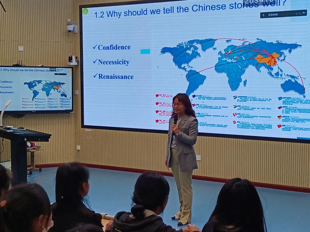 本场讲座主题为“Chinese Wisdom, Global Vision(立足全球视野,讲好中国故事)”,内容丰富,切入点新颖独特,知识性与趣味性相结合。刘娜立足国际视野,通过大量的图片和视频图文并茂地介绍了“天下”情怀以及“讲好中国故事”在国际文明交流方面的意义。从历史的视角为学生们介绍了向国际社会展示博大精深的中国智慧的重要性。通过介绍纪录片《中国愿景》和《柴米油盐之上》,生动直观地带领学生感悟新时代党和国家事业取得的历史性成就,在开阔文化视野和提升跨文化交际意识的同时,进一步增强了学生们在对外交流中的文化自信,激发了学习英语的兴趣,树立了讲好中国故事的目标和理想。