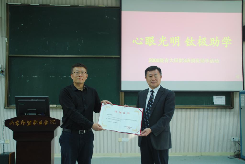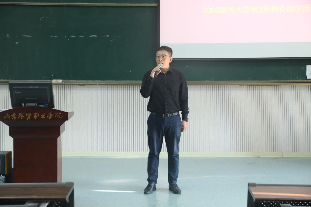 刁建东代表学院向2000级青大国贸三班的校友对母校的支持和同学们的关心表示感谢并向在座受捐助的同学介绍了2000级青大国贸三班的情况。他表示,学院的发展与各位校友的支持密不可分,捐资助学活动不仅为学生提供了物质帮助,更为母校的发展注入了强大精神动力,希望广大校友积极支持母校的建设和发展。最后,他号召同学们向优秀校友学习,在校学好专业知识努力成才,毕业后心怀感恩之情,今后有能力传承和发扬学长的爱心,以优异的成绩回报母校,回报社会,影响更多人。