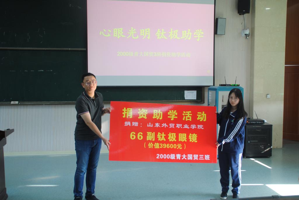6月15日,“心眼光明、钛极助学”2000级青大贸三毕业20周年返校捐资助学活动在2号教学楼A3阶梯教室举行,院长刁建东,时任2000级青大贸三班班主任张奉华,2000级青大贸三班校友万海航运青岛分公司副总经理王晓峰,上海新海丰集装箱运输有限公司青岛分公司销售经理王蒙,青岛海翔丰国际物流有限公司总经理李明亮,青岛普发世纪航运有限公司总经理李持斌,校友办副主任管涛以及受捐助学生参加。活动由团委书记刘嵩主持。