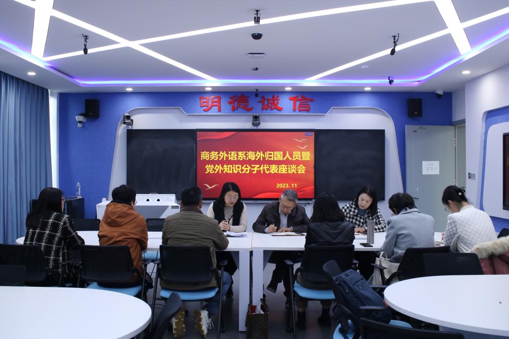 11月16日,商务外语系在2号教学楼C306举行海外归国人员暨党外知识分子代表座谈会,商务外语系党总支书记刘永美、系主任王应喜、商务外语系民主党派、无党派人士及海归青年学者代表出席会议。座谈会由刘永美主持。