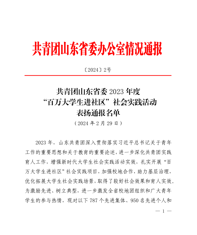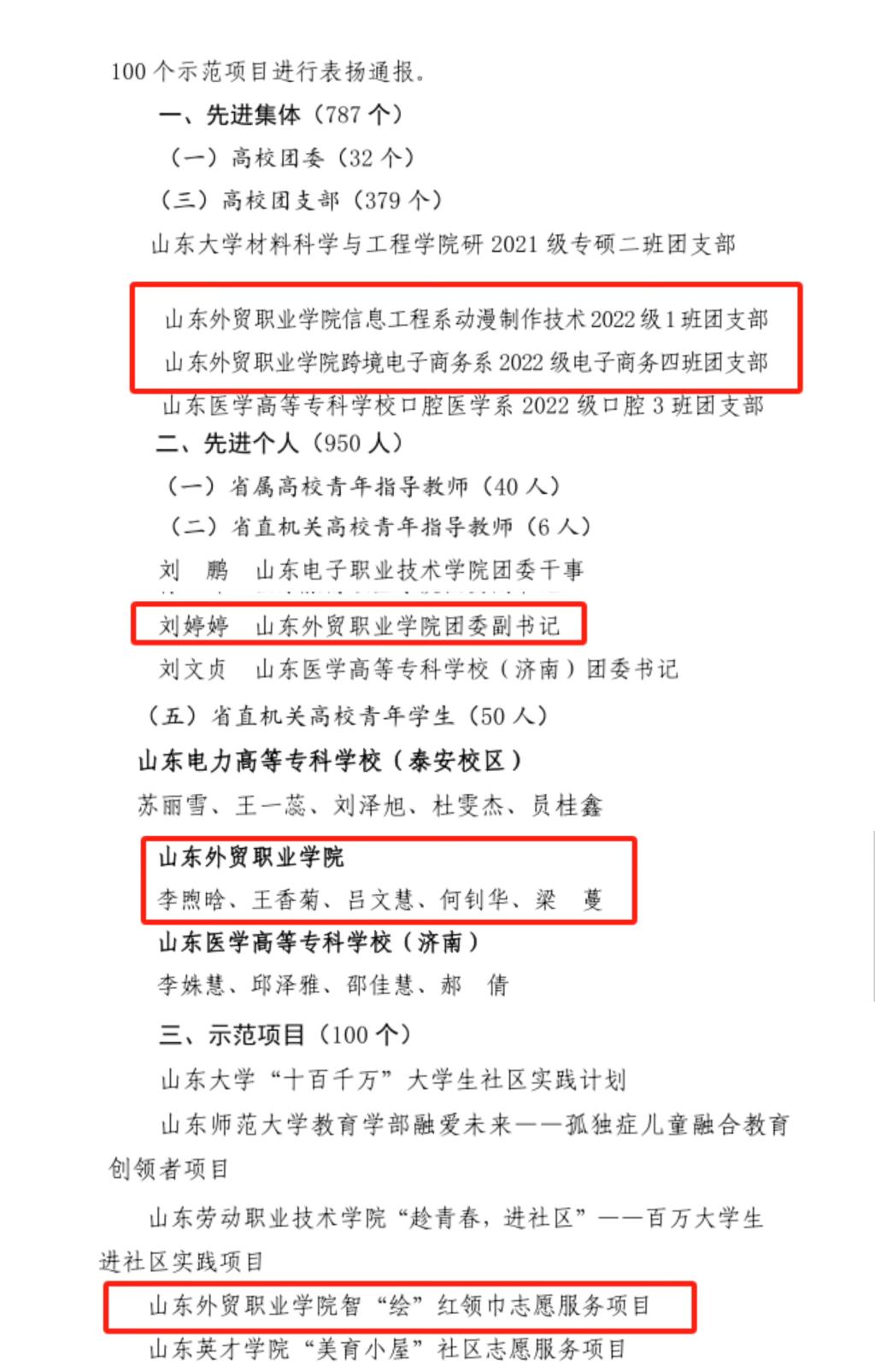 近日,共青团山东省委办公室发布《2023年度“百万大学生进社区”社会实践活动表扬通报名单》,我院信息工程系动漫制作技术2022级1班团支部、跨境电子商务系2022级电子商务四班团支部等2个团支部获评“先进集体”,李煦晗、王香菊、吕文慧、何钊华、梁蔓、刘婷婷等6名同志被评为“先进个人”,商务外语系智“绘”红领巾志愿服务项目被评为“示范项目”。