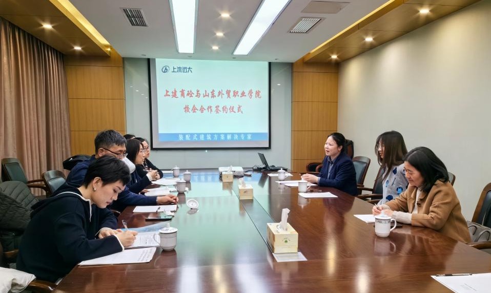 朱总监首先带领邱主任一行参观了一体化智能车间,介绍了在新旧动能转换的大背景下,打造绿色建筑标杆工厂的历程。在随后的座谈交流中,朱总监介绍了公司的发展状况、业务模式和发展方向,并充分肯定了24届会计专业毕业生张丹在实习期间的良好表现,希望与学院开展更深入的校企合作,共同培养更多优秀的财务人员。