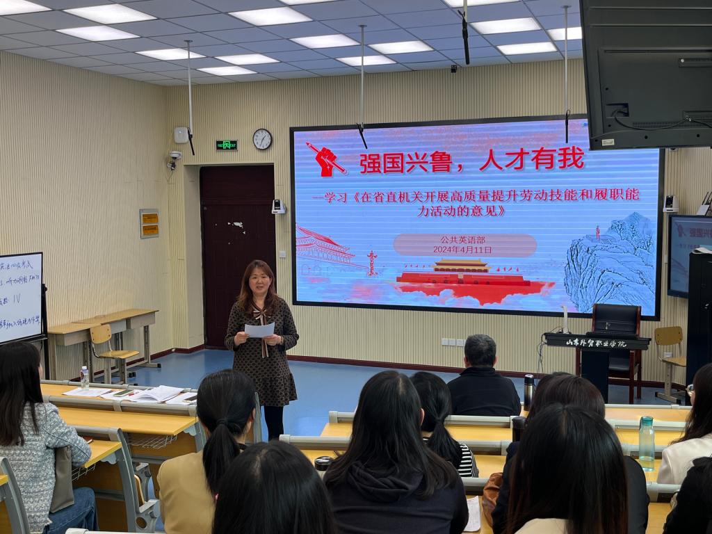 研讨会上,公共英语部主任崔卫围绕《在省直机关开展高质量提升劳动技能和履职能力活动的意见》内容(以下简称《意见》),深入解读文件精神,结合部门工作实际,鼓励教师积极参加技能竞赛、业务能力比武和学习、培训、练兵等活动,增强提升教学能力和履职能力的紧迫感和自觉性,坚持求真务实,创造性地开展工作。根据活动安排,鼓励教师们制定学习计划,深入研究推荐书目。部门也将有序部署“强国兴鲁,人才有我”系列活动,开展信息化教学工作坊、科研工作坊、青教赛赛前磨课等学习培训,组织教师参观校友企业等校外实践活动,不断提升教师专业素养、劳动技能和履职能力。