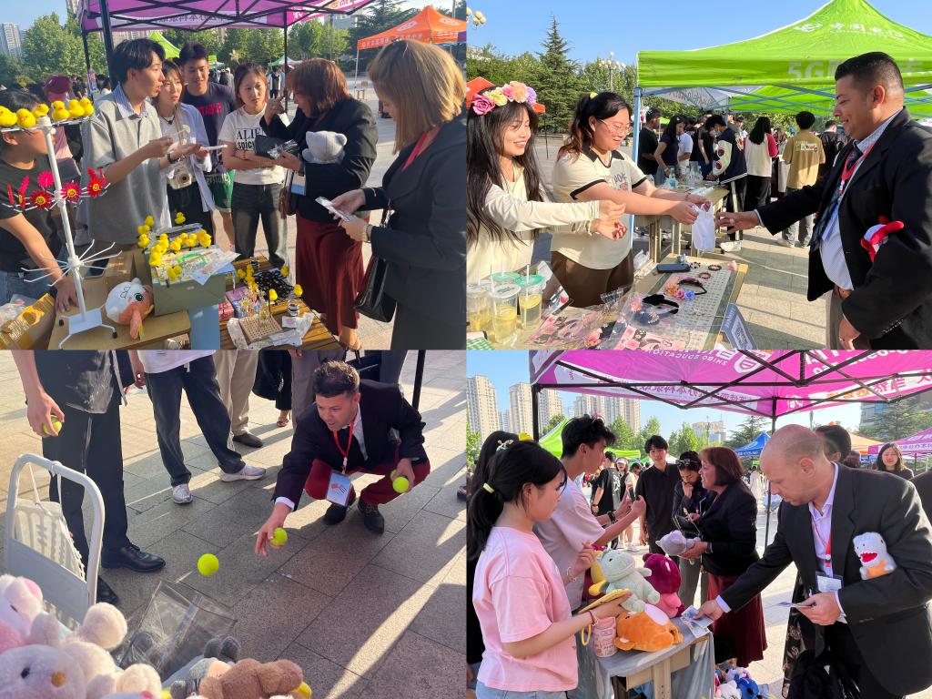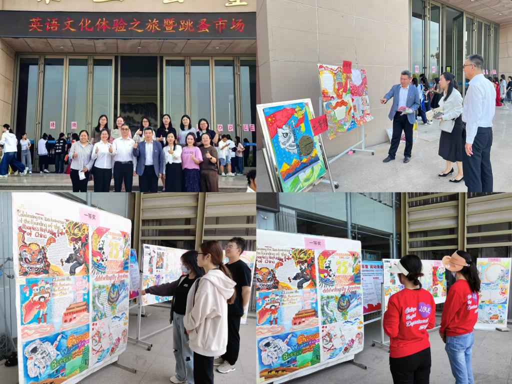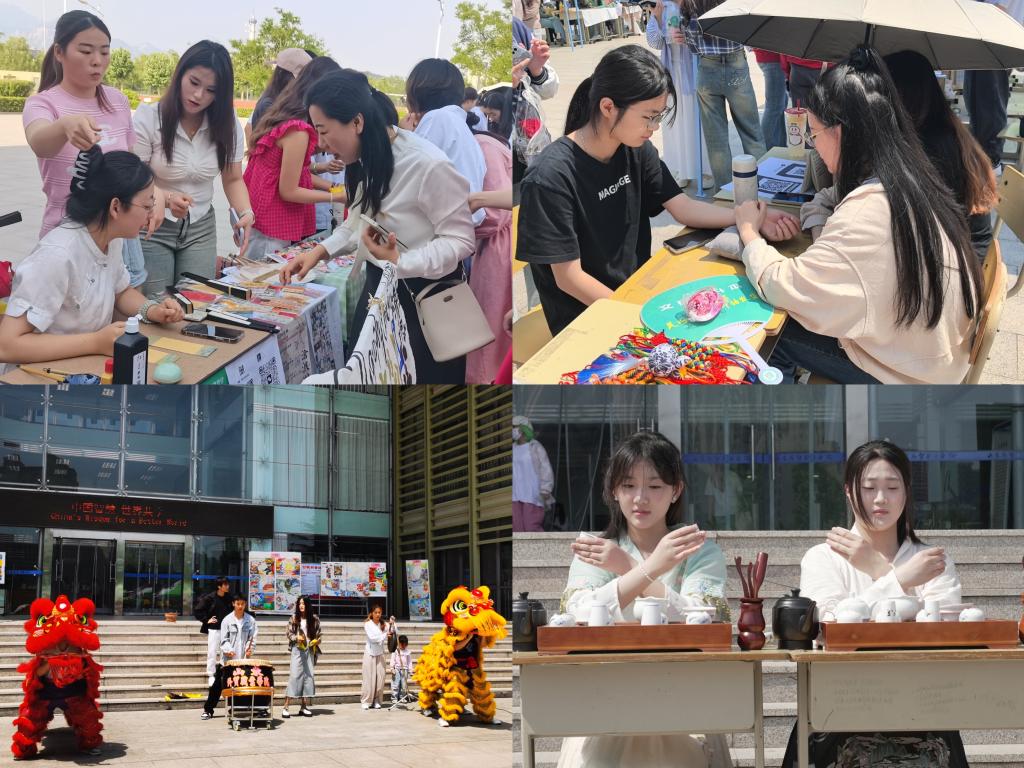 活动当天,跳蚤市场上人声鼎沸,热闹非凡。秉承着本届英语文化节“中国智慧,世界共享”的主题,两校区公共英语部和泰安教学部的英语教师们带领任课班级学生布置了近120个风格各异、充满创意的摊位。“摊主”们热情地用英语与前来选购的师生介绍自己的商品。此外,广场上还开设了丰富多彩的活动区域。在“英语国家文化体验区”和“趣味英语游戏区”,学生们通过参加各类有趣的小游戏以及与外教的现场互动中了解了英语国家的历史、文化和风俗习惯;“手抄报优秀作品展区”里22级和23级学生分别以“中国智慧,世界共享”和“庆祝中华人民共和国成立75周年”为主题进行设计,用英语和画笔表达了对祖国繁荣发展的自豪和祝福。在“路演互动区”里,英语俱乐部联合学院特色社团带来了精彩的现场演出,学生们通过歌曲、话剧、舞蹈、茶艺等多种形式展示了语言技能和对中国智慧的自豪感,赢得了现场观众的阵阵掌声。