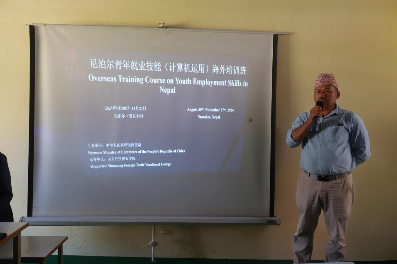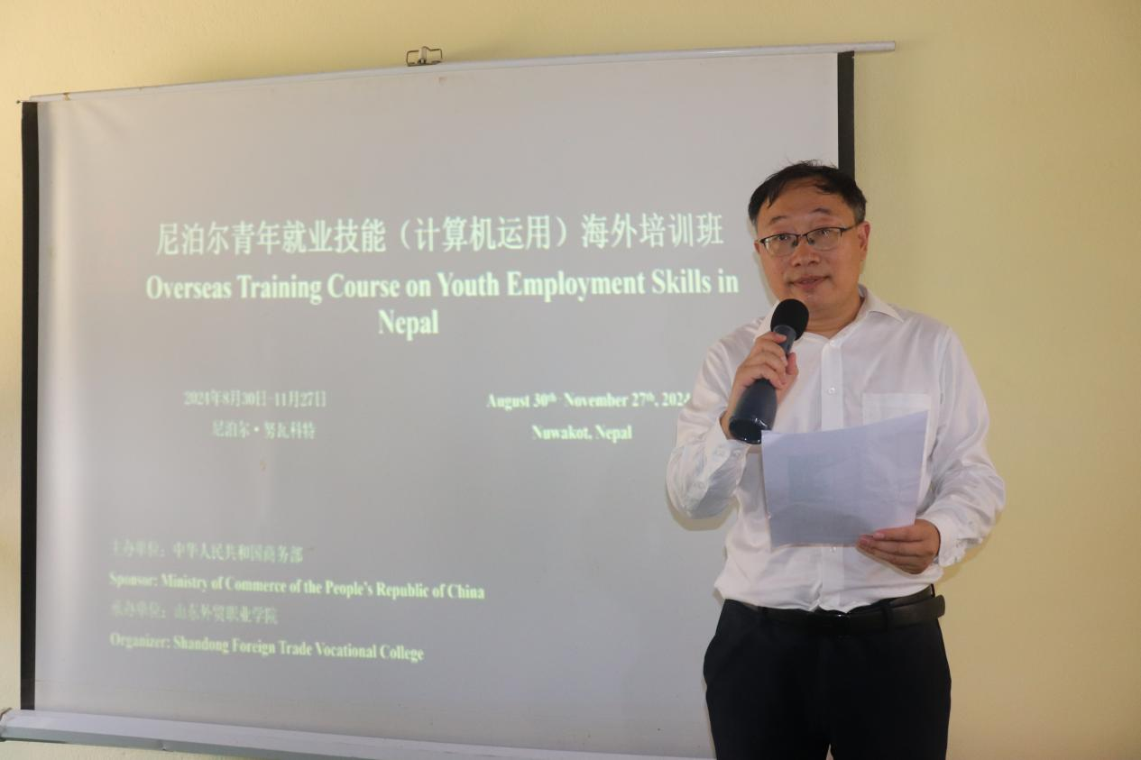 刘晓飞在致辞中介绍了山东省省情、学院优势特色和援外培训工作开展情况。他表示,学院近年来承办了“2019年牙买加云计算与大数据建设应用官员研修班”“2021年发展中国家云计算数据中心规划与建设研修班”“2023年贝宁职业技术教育培训班(计算机安装维修)”等多期计算机应用类培训班,经验丰富,本期培训班,通过培训让尼泊尔青年学员掌握计算机应用方面的一技之长,更好地帮助他们就业。