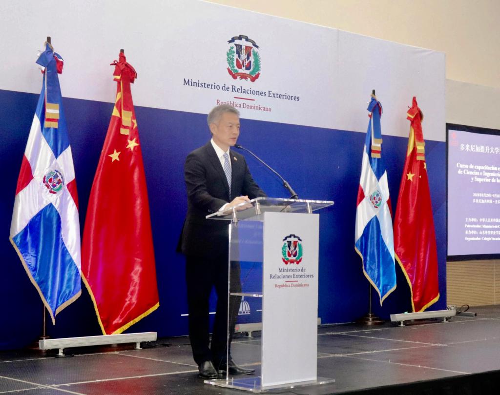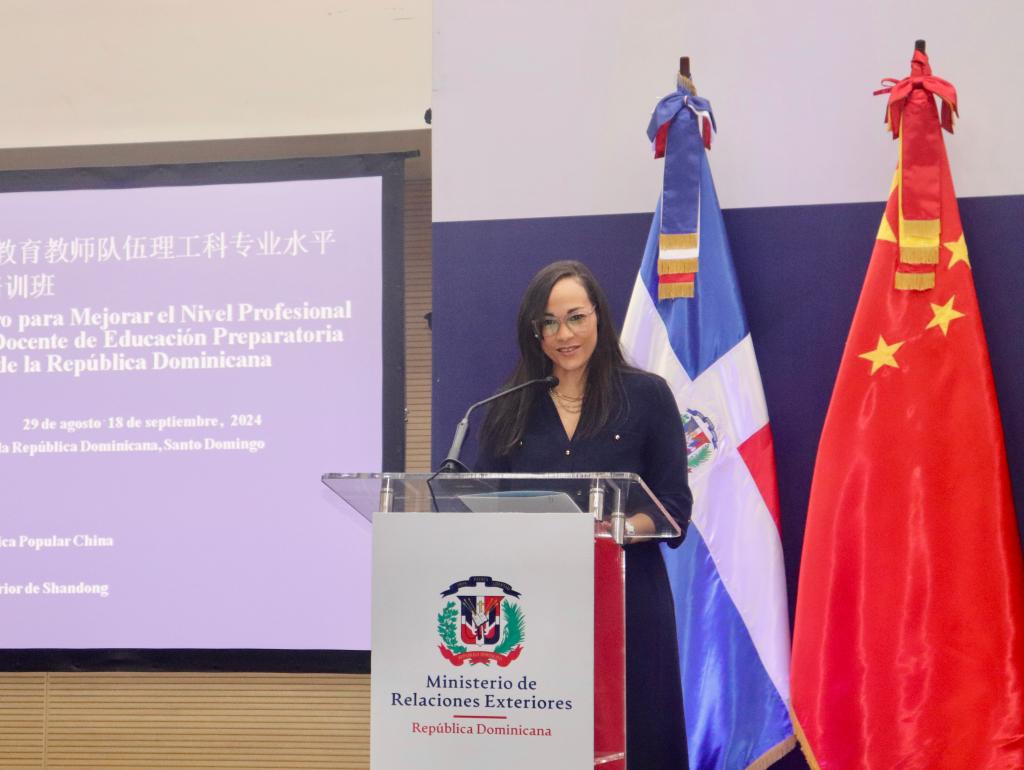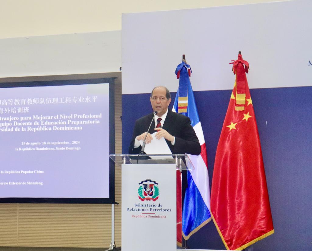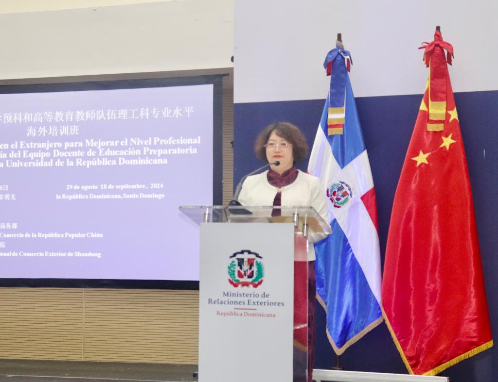 8月29日,由商务部主办、我院承办的“多米尼加提升大学预科和高等教育教师队伍理工科专业水平海外培训班”开班仪式在多米尼加首都圣多明各举行。中国驻多米尼加大使陈鲁宁、商务参赞孙倩媛,多米尼加高等教育、科学和技术部国际关系部副部长宝拉·蒂茜拉,多米尼加外交部亚洲及大洋洲司司长雷纳尔多·埃斯皮纳尔,多米尼加经济部双边合作司司长克拉拉·阿基诺以及我院国际官员研修学院院长王保红出席开班仪式并致辞。来自圣多明各自治大学、圣地亚哥科技大学、多米尼加国家技术培训学院等高校的55名学员将参加本次培训。
