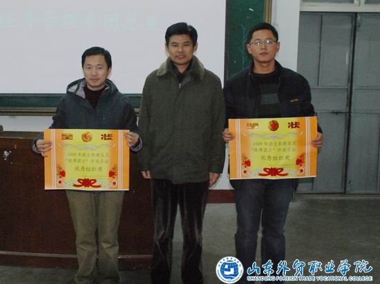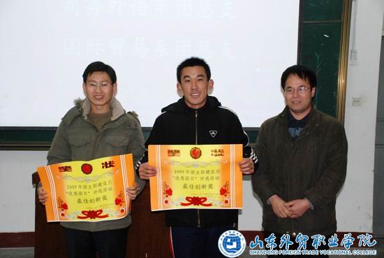团委书记孙茂峰宣读了2009年团支部建设月表彰决定,信息管理系团总支、经济管理系团总支获得优秀组织奖,国际贸易系团总支、商务外语系团总支获得最佳创新奖,09英一、09贸五等22个团支部分别获得优秀团日评选活动的一、二、三等奖。与会领导为获奖团组织颁发了奖状。