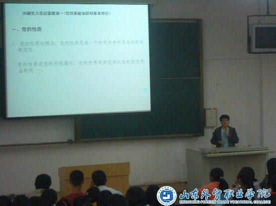 10月20日下午,商务外语系第七期党课培训班在B2阶梯教室开讲。我系党总支邀请了国际贸易系党总支书记韩淑君老师担任主讲,近400名09级新生参加了培训。