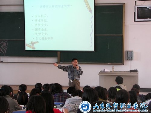 王老师结合当前的就业形势,针对外语专业的发展前景,为同学们做了详细的就业分析指导。他着重指出了三点:一是应尽早确立人生目标,为就业做好定位规划;二是要调整好就业心态,选择适合自己的职业;三是要脚踏实地,立足本职工作,不断创造新的价值。最后,他展示了不同工作场景的照片,并结合亲身经历生动形象地阐述了自身的工作经验。