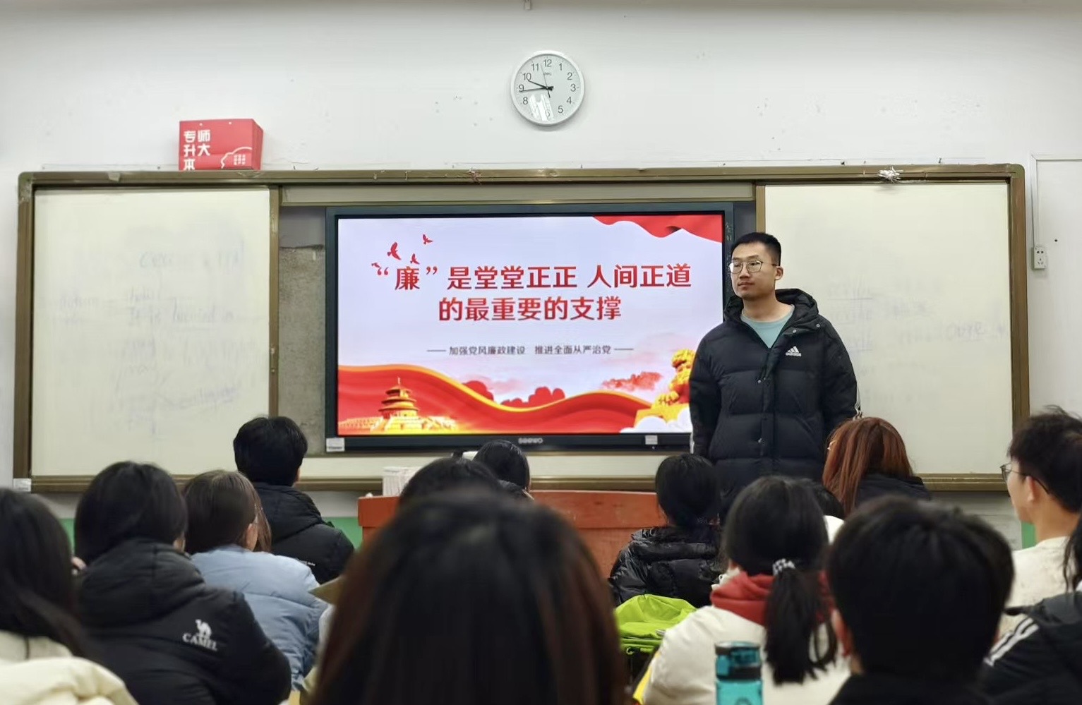 12月9日,党员教师代表宁帅为党员干部和学生入党积极分子们带来了一堂题为“‘廉’是堂堂正正走人间正道的最重要的支撑”的廉政文化公开课。课程内容涵盖了廉政文化的历史渊源、廉洁自律的重要性以及如何在日常工作和生活中践行廉洁自律。通过深入浅出的讲解和互动讨论,在座师生对廉政文化有了更深刻的认识,进一步增强了廉洁自律的自觉性和主动性。