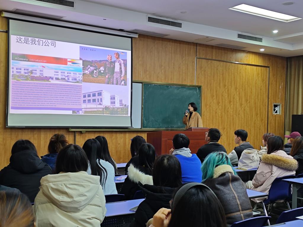 12月4日,泰安教学部国际商务教研室邀请2000级商务英语班优秀毕业生、现任泰安开普罗进出口有限公司外贸业务部经理张慧为2023级国际贸易专业学生作了主题为“一个外贸业务员的成长史”的精彩讲座。