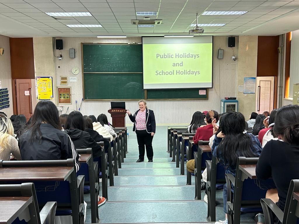 Rebecca围绕中英两国的假期为切入点,进行了西方假日文化介绍及个人假期经历分享。她通过生动的案例和互动提问,详细介绍了西方传统节日的起源与习俗,并与中国的重大节假日进行对比,此外,她还结合自身经历,讲述了不同文化背景下假期庆祝方式的独特魅力,引发了同学们的浓厚兴趣和积极讨论。
