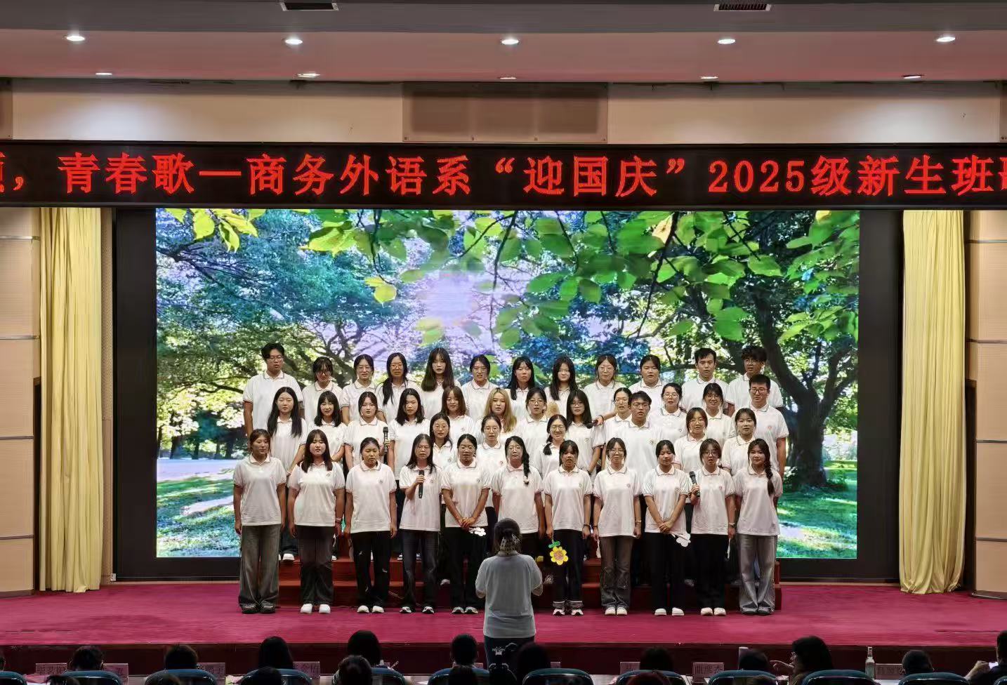 2025年9月29日晚,商务外语系在图书馆学术报告厅举办“山河颂,青春歌——商务外语系‘迎国庆’2025级新生班歌大赛”,商务外语系党总支书记刘永美、副主任昌利娜、全体辅导员、2025级班主任担任评委,全体新生班级参与了此次比赛。