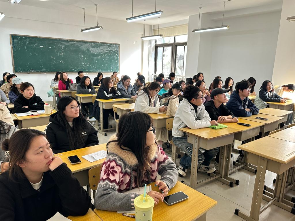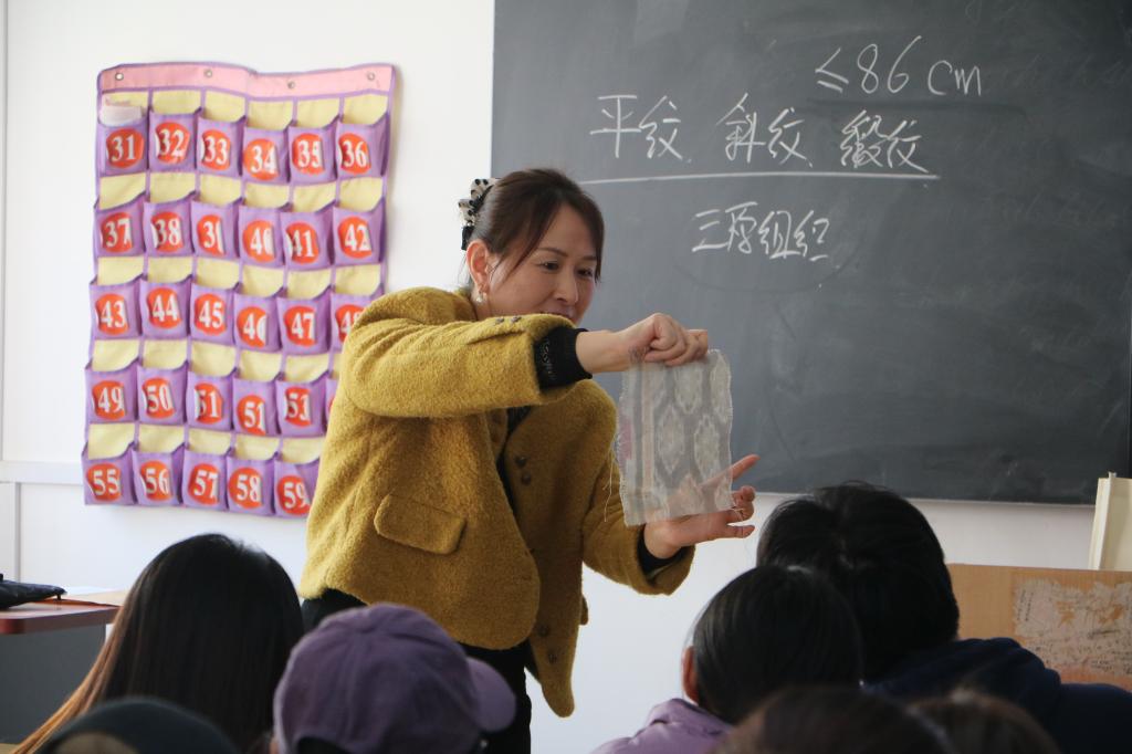 课堂上,张秀华老师首先用最新的海关统计数据,分析了目前我国纺织品的进出口现状,以及我国纺织品在外贸中的重要地位,接着她分享了2020年之后服装在纺织品出口占比中逐年下降、而纱线和织物的占比在逐年上升的趋势,这一数字背后体现了国家产业升级的发展思路,从而提出纺织品产业升级的方向就是高端化、智能化和绿色化。在技能实操教学环节,张老师采用了理论讲解+实物展示的教学方法,准备了具有代表性的各类纺织品样品,让学生在接触商品实物的过程中加深对商品的认知;课程最后她让每位学生都对自己穿的衣服进行鉴别,说明面料的种类,并对判断错误的学生进行一对一指导,通过这种方式,既可以让学生充分参与到课堂中来,还实现了对每一位学生个体的尊重。