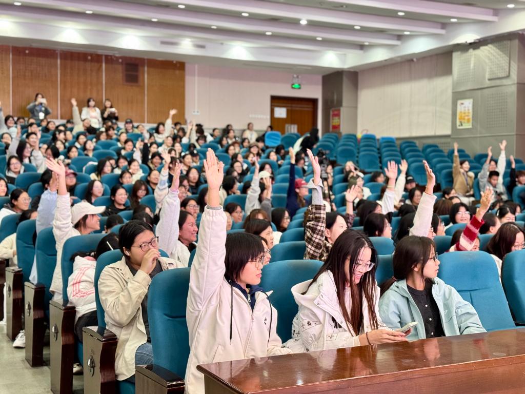 在接下来的讲座中,李艳华聚焦大学生阅读核心需求,围绕“为何读”“读什么”“如何读”三大问题展开,结合个人多年阅读心得和教学经验,以深厚的学术积淀和生动的阅读案例,深入浅出地剖析了大学阶段阅读的目的、阅读内容和阅读方法,引导同学们学会筛选经典书籍,在文字中遇见更广阔的天地。针对大学生普遍存在的阅读习惯难养成这一难题,她提出“从微习惯入手,持续性积累”的实践方法,倡导将阅读融入日常生活,使之成为一种自然的生活方式,真正实现以阅读赋能成长。整场讲座内容丰富、精彩纷呈,现场气氛热烈。互动环节中,同学们踊跃提问,就阅读方法、书籍选择等话题展开深入交流,主讲嘉宾耐心细致解答,赢得了现场阵阵掌声。