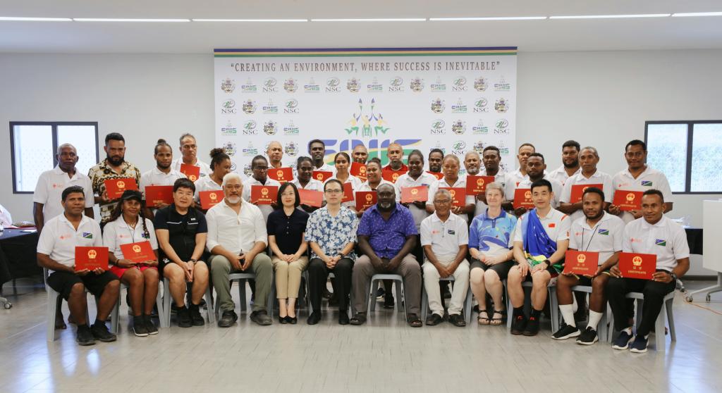 驻所罗门群岛使馆公参杨杰、所教育部长里奥卡纳、所体育委员会主席西卡和我院基础教学部主任吴晓明出席“所罗门群岛教练能力提升海外培训班”结业典礼并致辞。培训期间,来自所罗门群岛的90名大中小学体育教师和体委会官员,围绕体育教学的方法与策略、体育运动的组织与管理等主题进行了理论及实践学习。