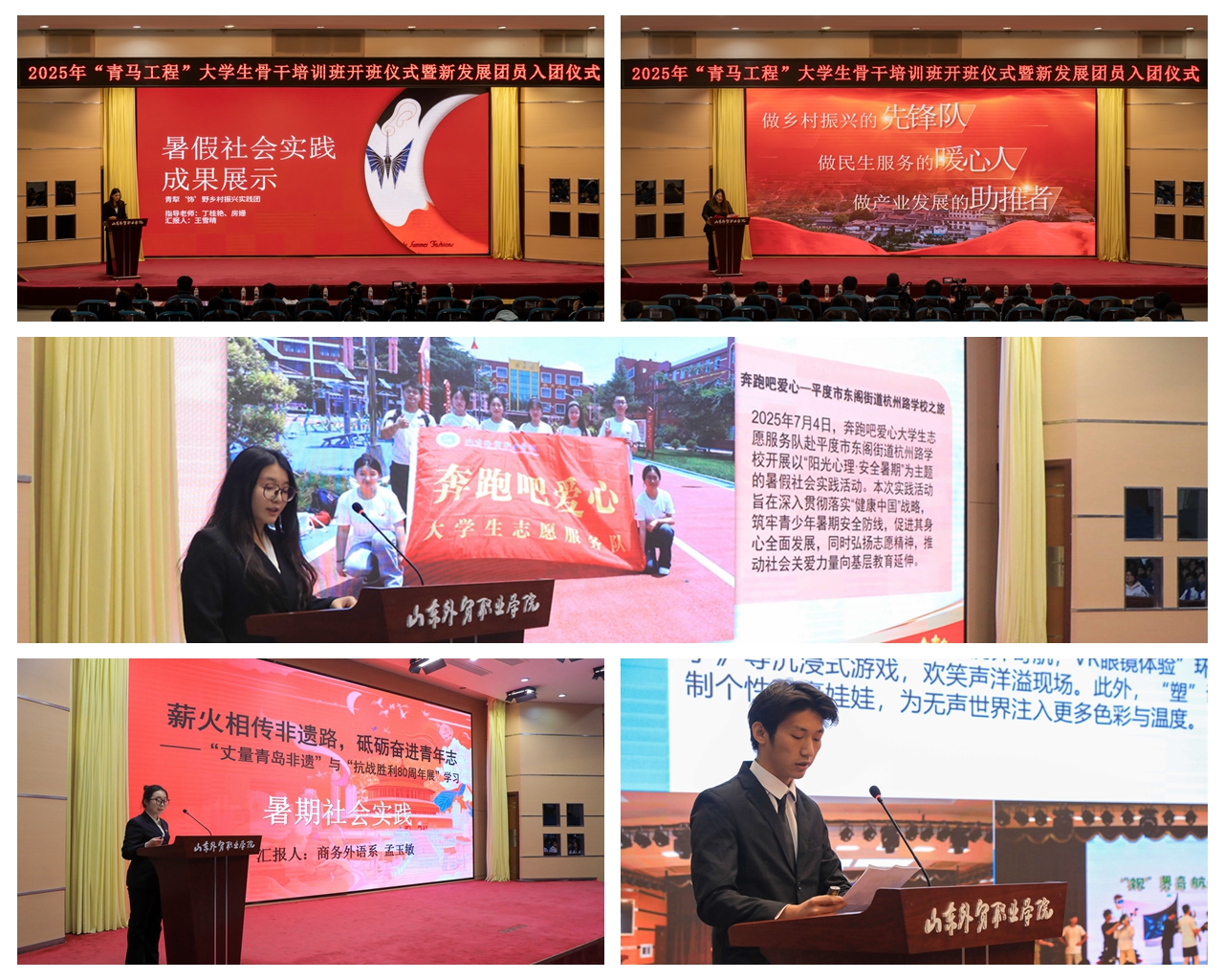 仪式在庄严的国歌声中拉开帷幕。团委书记刘嵩宣读开班通知,党委副书记黄维向本次“青马工程”培训班学员授旗,5支暑期社会实践团队代表作2025年暑期三下乡社会实践分享。随后,新发展团员入团仪式上,团委副书记刘婷婷宣读2025年下半年新发展团员名单,各系团总支书记为新发展团员代表颁发团员证并佩戴团徽。在优秀团员代表梁若涵同学的领誓下,新发展团员和本期青马工程学员面朝团旗,共同宣誓。新发展团员代表滕新祯和优秀团员代表马有福分享了自己的入团初心和奋斗经历,号召同学们砥砺品格、锻炼本领,让青春在实践中绽放绚丽光彩。仪式在齐声奏唱团歌中落幕。
