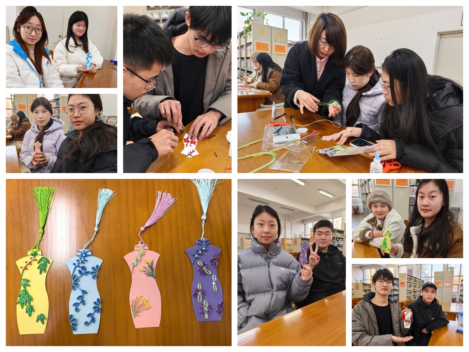 邀请商务外语系刘慧老师指导商外系学生学习衍纸技艺,创作中国风古典旗袍书签。通过卷、捏、拼、贴等工序,平面彩纸化为立体的旗袍衣襟、盘扣与纹样。一件件精巧的作品,不仅展现出东方服饰的典雅韵味,也让非遗技艺在年轻人手中传承延续。